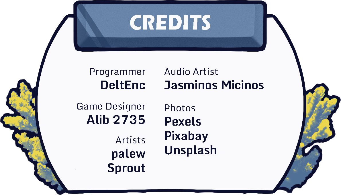 [Programmer, Leader] Akbar Al Fattah | [Game Designer] Ali Muhammad Khalib Irawan | [Artist] Ashyaqila Faustin & Valery Stephania Halim | [Audio Artist] Seruni Jasmine Raiamalika | [Photos source] Pexels, Pixabay, Unsplash